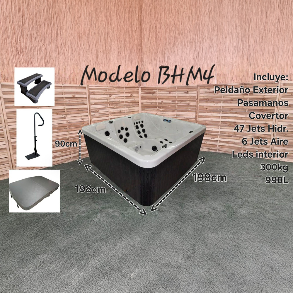 La BAÑERA HIDROMASAJE BHM 4 no solo destaca por su potente capacidad de masaje, sino también por su diseño funcional único. Adaptada a espacios modernos y elegantes, sus dimensiones son ideales para baños amplios: Largo de 1,98m, Ancho de 1,98m y Altura de 0,90m. Con un peso de 300 kg y una capacidad de 990 litros, tiene una capacidad para que disfruten 4 personas, se convierte en el complemento perfecto para transformar tu hogar en un espacio de bienestar superior.