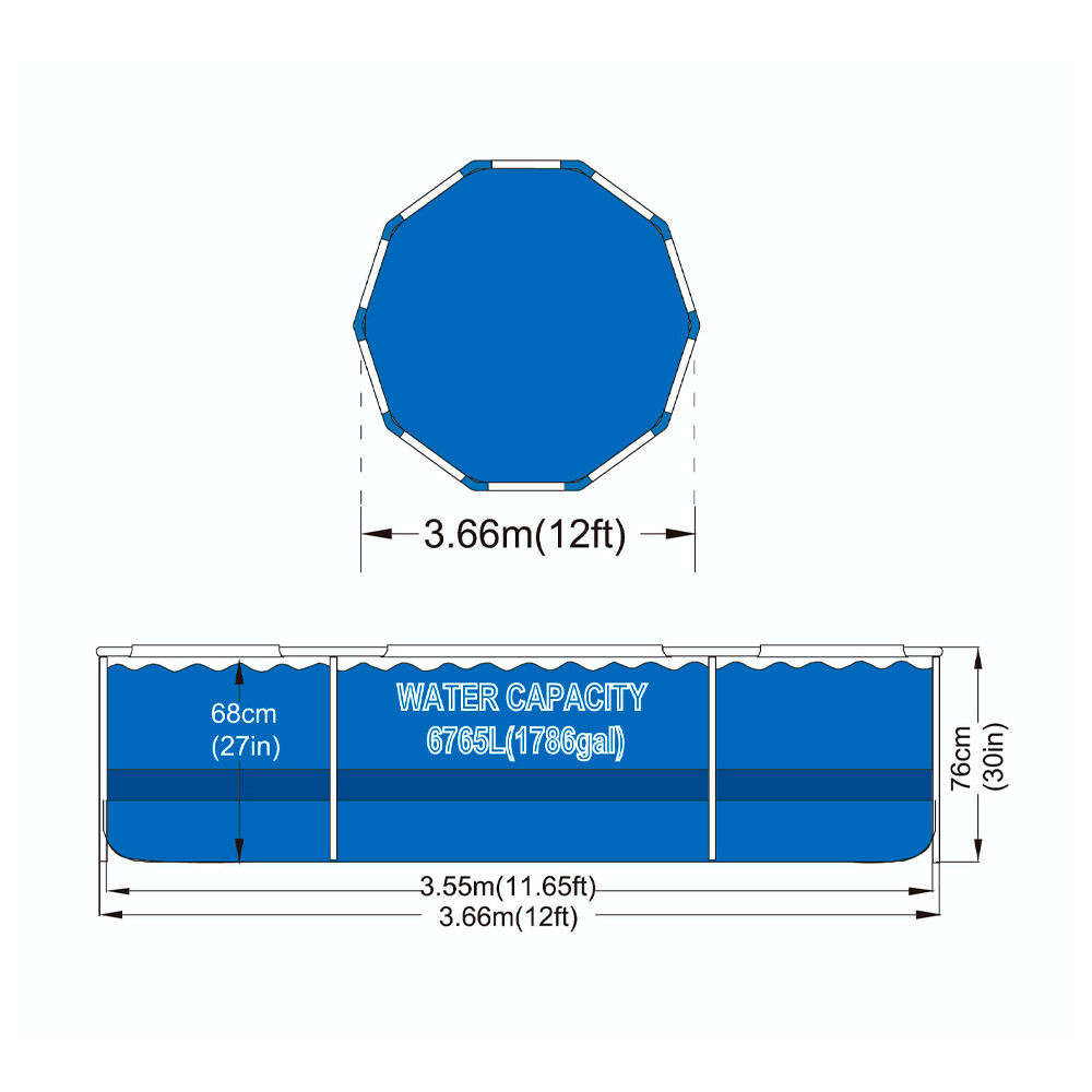 Diametro: 3,66 m Alt: 0,76 m Cap: 6765 L
